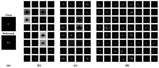 The output feature maps from (b) convolution layer 1, which are 32 images of pixels, (c) convolution layer 2, which are 32 images of pixels, and (d) convolution layer 3, which are 64 images of pixels, when the input a pair of focal and defocused images of test data set shown in (a) to the trained PD-CNN.