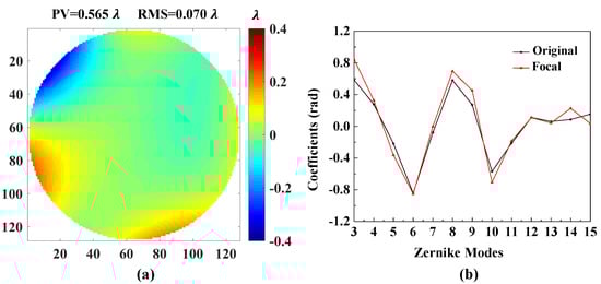 The result of the Focal model of PD-CNN. (a) The residual wavefront and (b) the comparison of the Figure 8b and the estimated Zernike coefficients. The unit of residual wavefront is . The unit of estimated Zernike coefficients is rad.