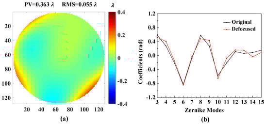 The result of the Defocused model of PD-CNN. (a) The residual wavefront and (b) the comparison of the Figure 8b and the estimated Zernike coefficients. The unit of residual wavefront is . The unit of estimated Zernike coefficients is rad.