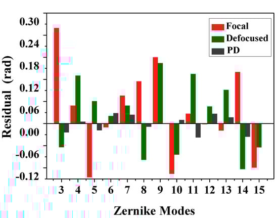 Figure 7 shows the accuracies of each Zernike coefficient estimated by PD-CNN. Apparently, the restoration accuracies of each order Zernike coefficients is still consistent with the PD model being optimal, followed by the Defocused model, and the Focal model has the worst conclusion. The results of PD-CNN models in test data set are shown in Table 4. The Original RMSE (Root Mean Square Error) and the standard error of test data set is . The Relative RMSE is equal to the ratio of Estimated RMSE to Original RMSE. The PD model has the smallest Estimated RMSE and the best robustness. Figure 8 shows a sample of test data set. The RMSE and PV of it are and . Figure 9, Figure 10 and Figure 11 show the results of the PD-CNN models with this sample as input. Figure 12 shows the residual wavefront of the three models. The residual wavefront is equal to the estimated wavefront minus the original wavefront. It can be intuitively seen that the PD model has the smallest measurement error.