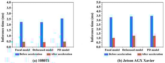 When compared with Xception, the PD-CNN network has an advantage in reference speed, so we further explore inference acceleration of PD-CNN. Firstly, we use TensorRT5.0 to optimize the PD-CNN models by combining layers and optimizing kernel selection for improving latency, throughput, power efficiency, and memory consumption, which are the critical factors that are used to measure the performance of software for inference of trained network. As the inference time of PD-CNN models shown in Table 5, the inference time of Focal model, Defocused model, and PD model on 1080Ti are as follows: ms, ms, and ms. After acceleration with TensorRT5.0, the inference time of them are ms, ms, and ms. As shown in Figure 13a, the inference speeds of the three models are very close, and PD model has the largest acceleration ratio.