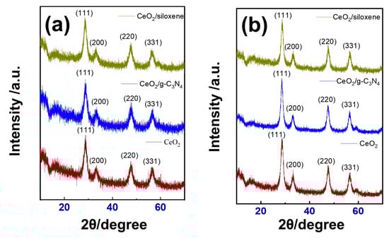 X-ray diffraction pattern of (a) cerium oxide (CeO2) and composites pyrolyzed at 350 °C, and (b) CeO2 and composites pyrolyzed at 450 °C.