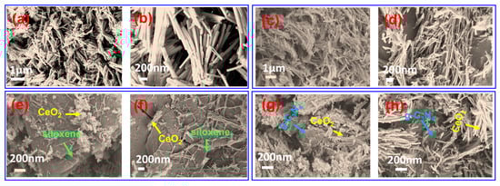 Scanning electron microscope (SEM) images of (a,b) Ce-MOF, pyrolyzed at 350 °C; (c) Bare CeO2; (e) CeO2/siloxene; (g) CeO2/graphitic carbon nitride (g-C3N4), pyrolyzed at 450 °C; (d) Bare CeO2; (f) CeO2/siloxene; and (h) CeO2/g-C3N4.