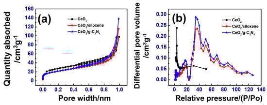 The surface area and porosity of the as-prepared CeO2-based composites (pyrolyzed at a temperature of 450 °C) were evaluated by BET analysis, and the N2 adsorption–desorption isotherms are shown in Figure 3a,b. As shown in Figure 3a, the isotherms of bare CeO2 and CeO2/siloxene and of CeO2/g-C3N4 showed the type IV isotherm having a sharp hysteresis loop in the relative pressure between 0.8 and 1.0, which suggests that the samples have a mesoporous structure. The BET surface area is calculated as 95.91, 75.73, and 78.23 m2 g−1 for CeO2, CeO2/siloxene, and CeO2/g-C3N4, respectively. The multilayer structure of siloxene and g-C3N4 might be responsible for dropping the surface area of the composites. Though the surface area of the CeO2/siloxene composite was lower than that of CeO2/g-C3N4, the planner structure of the siloxene is beneficial for π–π interaction with the dopamine structure, resulting in the enhanced sensing properties. Additionally, the mesoporous feature of the CeO2 composites was validated with a Barrett–Joyner–Halenda (BJH) analysis, as shown in Figure 3b. On the BJH curve, the samples exhibited a peak centered at around 3.7 nm, which could be the optimal pore size for electrolyte ion transportation during the electrochemical DA detection.