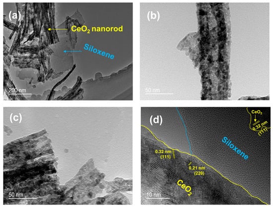 (a–c) Transmission electron microscopy (TEM) and (d) High-resolution transmission electron microscopy (HRTEM) images of the CeO2/siloxene composite.