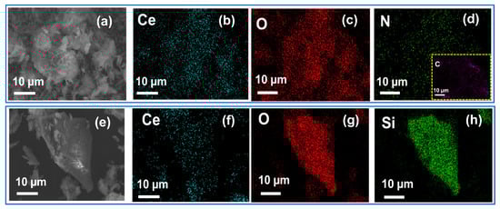 Energy-dispersive X-ray spectroscopy (EDS) elemental mapping of (a–d) CeO2/g-C3N4 and (e–h) CeO2/siloxene composites.