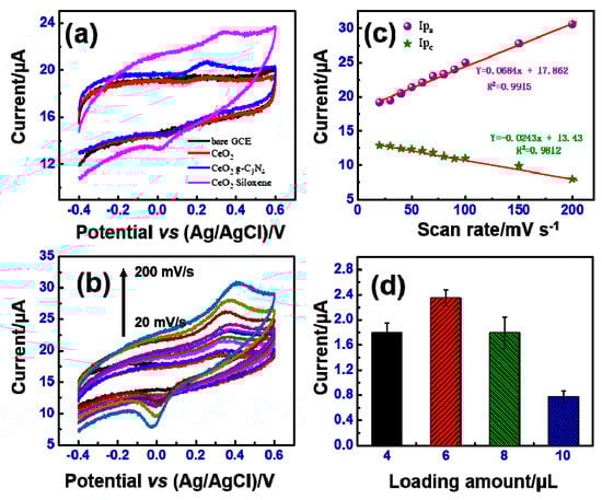 (a) Cyclic voltammetry response of bare glassy carbon electrodes (GCEs) and modified GCEs in 0.4 µM concentration dopamine (DA) containing 0.1 M phosphate-buffered saline (PBS) solution; (b) Cyclic voltammetry response of CeO2/siloxene-modified GCE electrode at different scan rates in 0.4 µM concentration DA containing 0.1 M PBS; (c) Calibration curve of the anodic and cathodic peak current versus the scan rate of the CeO2/siloxene-modified electrode; (d) The cyclic voltammetry peak current versus the different amounts of CeO2/siloxene loading.