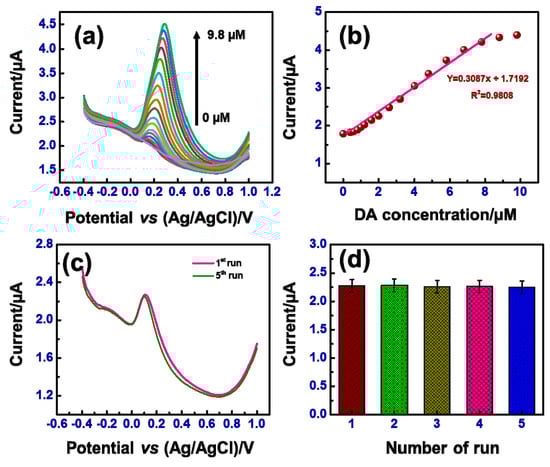 (a) Differential pulse voltammetry (DPV) response of the CeO2/siloxene-modified electrode in 0.1 M PBS solution containing different concentrations of DA; (b) Linear response of the oxidation current versus DA concentrations; (c) Repeatability of a modified electrode in the presence of 1 µM of DA-containing 0.1 M PBS solution; (d) Plot of the oxidation current versus the run number for five consecutive measurements.