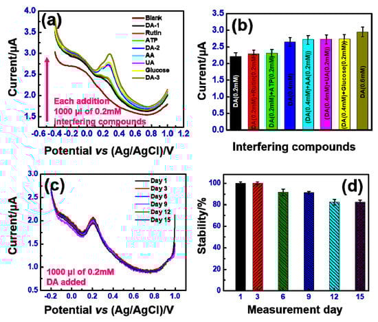(a) Interference analysis of the CeO2/siloxene-modified electrode in the presence of other interfering compounds; (b) Current change response to the interfering compounds; (c,d) Stability of the CeO2/siloxene-modified electrode in the presence of 1000 µL of 0.2 mM of DA containing 0.1 M PBS solution.
