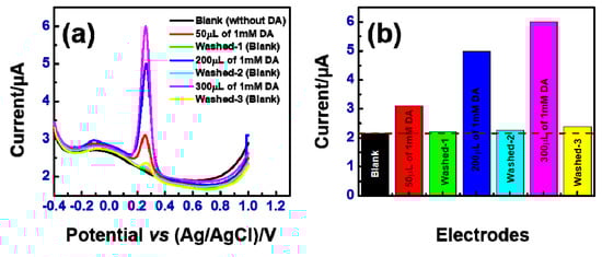 (a) DPV response of the CeO2/siloxene modified electrode before and after washing in blank and DA containing PBS solutions; (b) Current changes bar chart before and after washed the electrodes.