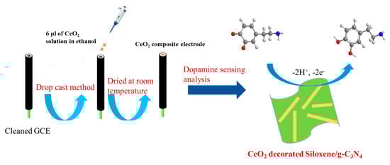 Initially, aluminum oxide powder of 0.05 μM was used to polish a bare glassy carbon electrode (GCE). After that, the electrode was sonicated for 5 min in the deionized water and dried at room temperature. Meanwhile, 5 mg of active material (CeO2, CeO2/siloxene, CeO2/g-C3N4) was inserted into 5 mL of ethanol solution and sonicated for 30 min. Later, 6 μL of the active material solution was coated on the polished GCE by the drop-casting method and allowed to dry at room temperature. Scheme 2 shows the fabrication of the CeO2/siloxene- and g-C3N4-modified GCE electrodes and the DA sensing mechanism. Cyclic Voltammetry (CV) was used to optimize the electrodes for enhanced redox performance of DA detection. After that, the differential pulse voltammetry (DPV) technique was employed to investigate the DA detection of the modified electrode (CeO2/siloxene/GCE) in the 0.1 M phosphate-buffered saline (PBS, pH = 7.0) solution under different concentrations of DA. The interference study in the presence of interfering compounds was carried out after washing the electrodes by the consecutive addition of various analytes to avoid the formation of contaminates. The repeatability test was carried out with a CeO2/siloxene/GCE electrode for five consecutive runs, and the stability of the CeO2/siloxene/GCE electrode was examined for 15 days in the presence of 1000 µL of 0.2 mM of DA-containing 0.1 M PBS solution by the DPV measurement.