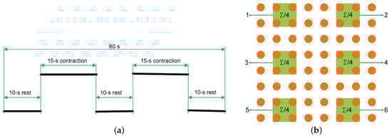 (a) Scheme of the measurement protocol. (b) Six subsets of electrodes employed to generate six electromyogram (EMG) signals.