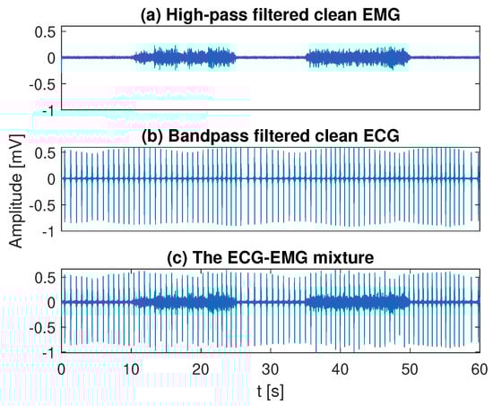 An example of the EMG (a), ECG (b), and their mixture (c).