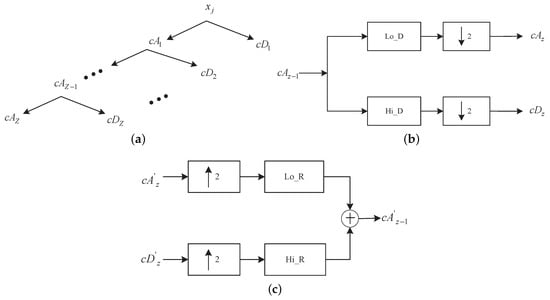 Schematic of wavelet decomposition. indicates the decomposition level and . (a) Structure of the J level decomposition tree; (b) operation in each level to decompose the signal; (c) operation in each level to reconstruct the signal.