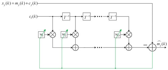 Structure of the adaptive filter. is the EMG–ECG mixture in the jth channel, is one of the nine ECG leads in the same dataset as but was not used for mixing, indicates a one-sample delay, and O is the filter order.