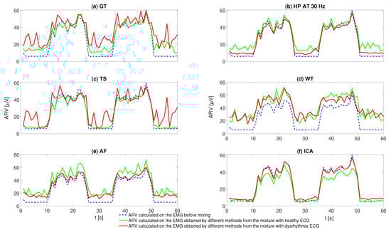 Example of the ARV results calculated from the EMG signals obtained by different ECG removal methods: (a) ARV results by GT; (b) ARV results by HP; (c) ARV results by TS; (d) ARV results by WT; (e) ARV results by AF; (f) ARV results by ICA.