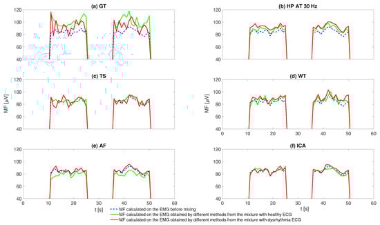 Figure 7 shows a representative example of the MF results calculated using the same sliding window as used for ARV, but applied during the contraction periods only. For the EMG–ECG mixture with healthy ECG (solid green line), overestimates in MF can be observed with GT and HP while underestimates are obtained with AF. TS produces the best MF results. Data with dysrhythmia ECG (solid red line) show a similar trend. However, AF produces much less underestimation, while TS performs slightly worse as compared with data with healthy ECG.