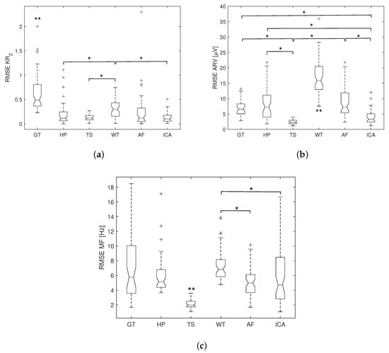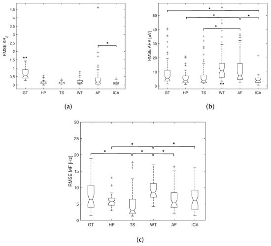 Boxplot of the RMSE results for different ECG removal methods with healthy ECG interference: (a) RMSE in ; (b) RMSE in ARV; (c) RMSE in MF. Data are presented as median, the first and third quartiles, and the upper and lower adjacent. indicates the outliers (whisker length = 1.5). ** indicates significant () difference from all other methods, and * indicates significant () difference between two methods.