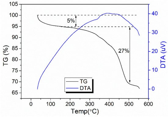 The FeBDC MOF powder will be used as a template of iron oxide material by pyrolyzing at 500 °C under a nitrogen atmosphere for 120 min. The pyrolisis was carried out at the temperature of 500 °C based on the results of the TG/DTA of the MOF FeBDC material. TG/DTA aims to characterize the thermal properties of the material based on the material’s response to temperature. The results of the TG/DTA thermal analysis are used to determine the pyrolysis temperature required by FeBDC MOF to be able to become Fe3O4 entirely. The TG/DTA analysis result can be seen in Figure 2.