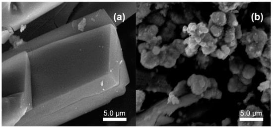 SEM analysis was performed to determine the surface morphology characteristics of a material. Figure 4a shows SEM images from the synthesized FeBDC MOF. It shows that the FeBDC MOF has a particle shape, such as the FeBDC MOF produced by Liu et al. in 2017 []. The solvothermal method at 105 °C drove the formation of bulky triangular rodlike FeBDC with an average size of 20 µm. Similar bulky rodlike particles have been observed by other works indicating the typical shape of FeBDC []. It has been reported that the oxidation state of the Fe source affects the resulted shape and size. Small bulky particles transformed into bigger bulky-rodlike shape particle when FeCl3 replace to FeCl2. The use of FeCl2 in this work is in agreement with the previous report []. The coordination between oxygen atom from DMF solvent and Fe (II) forming FeO6 octahedral and BDC-bridging results in crystal growth in one dimensional []. Based on the two test results, XRD and SEM test, it can be concluded that the FeBDC MOF has been successfully synthesized using the solvothermal method because the crystallinity and morphology are in accordance with the reference FeBDC. However, FeBDC derived Fe3O4 is found to be very different from that of FeBDC, indicating the MOF cannot maintain its shape during heat treatment. The converted Fe3O4 has an irregular spherical shape with the size in the range of 1–3 µm. The decomposition of the organic linker causes the structure to be collapsed to smaller particles. Indeed, Figure 4b shows a noticeable deficiency in crystallinity, trending an amorphous nature of Fe3O4 with a strongly defective surface. The remarkable change in morphological properties between FeBDC and Fe3O4 can lead to a respective movement of functional group bonds in the structure, which could also be supported by the FTIR technique in Figure 5.