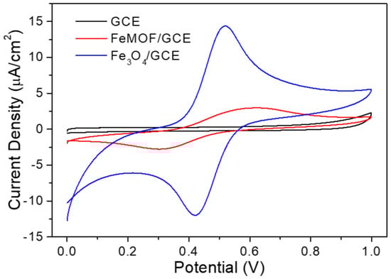 Cyclic Voltamogram (CV) spectra of bare GCE, FeBDC/GCE. Fe3O4/GCE in 3 mM of glucose and Phosphate Buffer Saline (PBS) of 0.1 M pH 7.4.