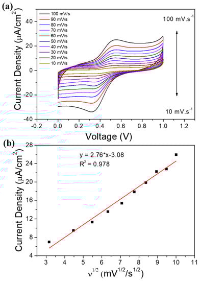 (a) CV curves for Fe3O4/GCE in different scan rate (10, 20, 30, 40, 50, 60, 70, 80, 90, and 100 mV.s−1) in 0.5 mM of glucose in 0.1 M of PBS solution pH 7.4; (b) linear regression plot for the increasing scan rate.