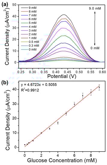 As mentioned earlier, the interaction between active surface and glucose in the medium of PBS generated current at a specific voltage. To determine the effect of glucose concentration on the resulting currents, we carried out DPV measurements. DPV measurement is considered as a suitable technique due to it can minimize the effects of capacitive currents that occur in glucose oxidation so that the measured current is pure faradaic current arising from the influence of glucose concentration. The measurement was done by varying the value of glucose concentration in the range 0.0–9.0 mM in PBS solution 0.1 M pH 7.4, and the results are shown in Figure 8a. In contrast, the linear regression plot between values of the resulting current density at a particular concentration to the value of the concentration of glucose contained in the test solution is shown in Figure 8b. The selection of glucose concentration values is based on the category of glucose levels in human blood. The American Diabetes Association defines prediabetes as a condition with a fasting glucose level of 100 to 126 mg/dL or 5.6–6.9 mM []. Therefore, variations in concentrations that have a value below the range, within that range, and above that range are chosen to see whether the sample material is potential to be used as glucose-sensing material in the 5.6–6.9 mM of glucose concentration range (prediabetic conditions). The results of DPV measurements show that all the DPV curves in Figure 8a exhibit broad anodic peaks.