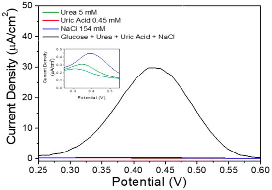 Selectivity testing in this study aims to determine whether the sensor material can detect glucose without being affected by competing species commonly found in the blood. The test was performed using the DPV measurement. The testing process was carried out by giving NaCl, Uric Acid, and urea concentrations according to their respective average concentrations in blood (154 mM; 0.45 mM and 5 mM respectively) and glucose concentrations in the middle of the 3–9 mM detection range, i.e., 6 mM in the 0.1 M ofPBS solution pH 7.4. Figure 9 shows the results of selectivity testing. It appears that the measured current is almost unchanged (29.8 μA to 29.9 μA). This small change in current indicates that the sample material is far more sensitive to glucose than other analytes (Urea, Uric Acid, and NaCl) in the selected potential window and also suggests that the measurement of glucose by FeMOF-derived Fe3O4 will not be disturbed by other analytes. This result shows that Fe3O4 is selective against glucose when compared to NaCl, Uric Acid, and Urea.