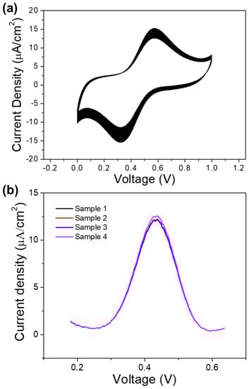 The CVs for Fe3O4 modified GCE in 0.1 M of PBS pH 7.4 containing 3 mM of glucose, were recorded for 25 cycles to find stability. The result is shown in Figure 10a. The current peak in the 25th cycle was found to be 80.25% of the current in the first cycle, indicating that the modified electrode has relatively good stability. Four different GCE were modified with the Fe3O4, and their response towards the oxidation of 3 mM of glucose was tested to find the reproducibility of the modified electrode, and the result is shown in Figure 10b. The current peaks obtained in the five repeated measurements of four independent electrodes showed relative standard deviance of 1.60%, confirming that the results are reproducible.