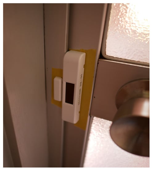 - Door Sensor: Door sensors were installed at the entrance and bathroom doors using the same procedure that was described for the motion sensor. The main body of the sensor was installed on the door, and the magnet was installed on the door frame (Figure 3).
