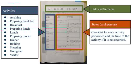 The experimental targets were ten homes that were occupied by elderly people in the vicinity of Ikoma City, Nara Prefecture. Of the ten targets, three were single-occupant dwellings, and seven were two-occupant homes. All of the participants were in their 60 s to 80 s and they were selected from public volunteers. The purpose, method, and significance of the experiment, along with the voluntary nature of consent, the possibility of consent revocation, and relevant privacy considerations, were explained in writing and orally to all participants prior to the experiment, and written consent in the form of signed consent forms was obtained from each. For each system setup, motion sensors (6 to 10), ambient sensors (7 to 10), and door sensors (1 or 2) were installed according to the floor plan of the home. Here, it should be noted that door sensors could sometimes not be installed due to the shape and materials of the door. However, generally speaking, the installation process, including participant briefings, sensor installation, and data server setup, was all completed within one hour.