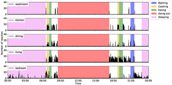 In this subsection, we describe the sensing results that were obtained via the proposed system. Figure 6 and Figure 7 show the ADL data collected from a single-resident home, as well as the number of motion sensor reactions and noise levels in the main rooms. These collected ADL data indicate that the participant woke up at 06:00 a.m. and started preparing breakfast. After that, the participant went out from 09:00 a.m. and remained out until the evening. He then prepared dinner, took a bath, and went to bed at around 23:00 p.m. Focusing on the number of motion sensor reactions in the kitchen, we confirmed that the activation frequency during “cooking” is higher than the other sensor reactions. Similarly, we can confirm higher levels of reactions in the living room during meals and in the bedroom during “sleeping”. In addition, the frequency of reactions in the kitchen was higher before and after “bathing”. This is due to the fact that the kitchen and the bathroom are located next to each other. Therefore, we consider it proven that the sensor could detect the movements of the participants.