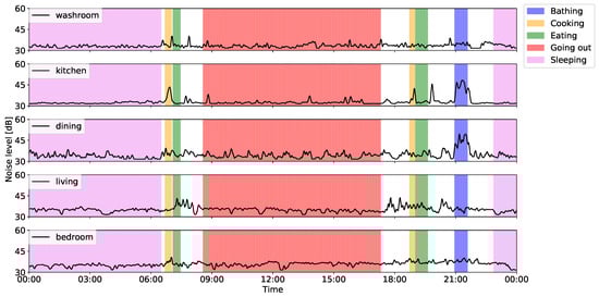 Focusing on the noise level, we found that noise increased in the kitchen after meals, primarily because the sensor detected washing dish activity. Furthermore, because the noise level of the kitchen next to the bathroom increased during “bathing”, we confirmed that the noise sensor could collect bathing information that was not detected by the motion sensors. From these results, we concluded that our proposed system could collect sensor data that can provide an adequate overview of resident ADL data and would, thus, be useful for anomaly detection and/or activity recognition.