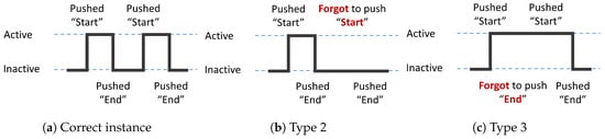 - First, we constructed a sensing system that fulfills Reqs. (i)–(v) by assuming that the system would be used by typical elderly people. Because our proposed system consists of energy harvesting sensors, long-term driven environmental sensors, and simple annotation pushbuttons, it is senior-friendly and does not violate user privacy. The use of maintenance-free sensors allows for long-term data collection (Reqs. (i), (iii), and (iv)). Additionally, because the proposed system is not affected by residence floor plans, it can be easily installed in a wide variety of different homes (Req. (ii)). Additionally, the resident’s burden for annotation can be reduced by using simple pushbuttons unlike existing works such as CASAS SHiB or Kasteren’s system that use complicated software or wearable mic devices for annotation (Req. (v)). Through installation and operation in ten typical homes occupied by elderly residents, we confirmed that our proposed system fulfills Reqs. (i)–(v). Furthermore, we confirmed that our proposed system could correctly collect ADL data by visualizing the relationships between the ADL and sensor data that were collected during the experiment.