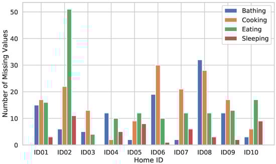 In this section, we used a deep learning model to examine activity recognition levels in order to ensure that the data collected by our proposed system can perform activity recognition with sufficient accuracy in ordinary environments. We will begin by describing the data imputation and preprocessing methods that are required for activity recognition. Then, we describe the algorithm of activity recognition and evaluation method using long short-term memory (LSTM). In a previous study [57], we reported the results of a preliminary analysis conducted on one home. In this analysis, the missing value imputation method is improved based on the results of that preliminary analysis, after which it is performed on all ten of the homes participating in our experiment.