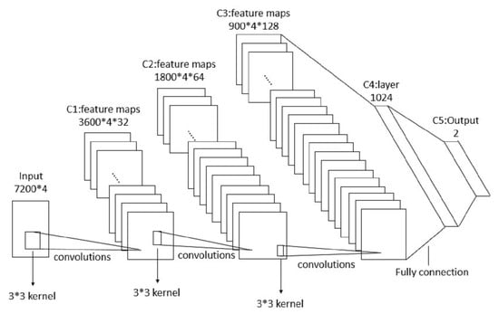 All the strides of the pooling layer we used are [1 × 2] and size of kernels is also [1 × 2]. A pooling layer is connected after each convolutional layer and a ReLu layer is connected after each normalization layer. Considering that small convolution can extract more detailed information, in the experiment, all of our convolution kernels are 3 × 3 in size. In Figure 2, the first convolutional layer includes 32-channels convolution kernels for extract features of the input current signals, and the output result is input to the second convolutional layer and filtered with 64-channels convolution kernels. The third convolution layer connects the output of the second hidden layer with 128-channels convolution kernels. Then, we reshape the output size of the third hidden layer [4,900,512] to [1, 4 × 900 × 512], the fully connected layer takes the reshaped vector as input for feature integration. Finally, we predict the signal category through a softmax layer.