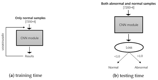 The architecture of CNN-AD. (a) In the training stage, CNN-AD is trained by only normal samples, the label is [1,0], then the cross entropy is calculated through the label and the output of the network, and Adam is used for network optimization. (b) In the test stage, CNN-AD divides the test set containing both normal and abnormal samples into two categories by threshold.