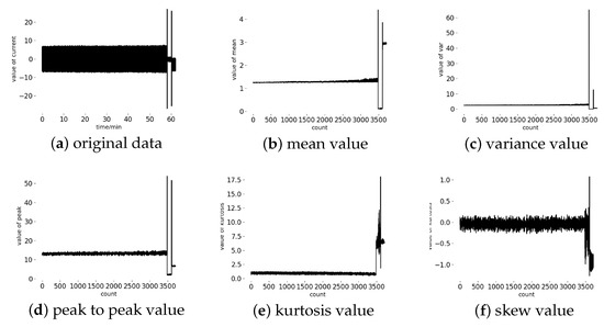 After wiping off the unnecessary current data, such as a reset signal, we analyzed the mean, variance, peak-to-peak, kurtosis and skew with a full life cycle of a tool. Figure 4a shows the whole life cycle of a tool. The rest of Figure 4, we compared the result of the time domain features with the original data. These features with a time span of 1 s have no obvious trend in the Figure 4, but we can observe that a mutation appeared in both of these features. Comparing Figure 4 and Table 3, it can be observed that the dramatic change of the current signal appears at 52–61 min and corresponds to abnormal in Table 3.