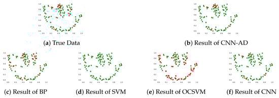 The difference between positive samples was small, from the confusion matrix of each model (Table 5), the performance of models in positive samples is satisfactory, SVM, CNN and CNN-AD can even achieve 100% accuracy of positive samples. The main difference in the performance of these models lies in the prediction of negative samples, the prediction accuracy of each models in negative samples was 75% (BP), 0% (SVM), 12.50% (OCSVM), 50% (CNN), 87.5% (CNN-AD) respectively. In the comparison of anomaly detection methods, OCSVM is better than SVM in judging abnormal samples, while the judging performance of normal samples is poor. This may be due to the small difference of the sample points in the multi-dimensional space (Figure 11), and the sample points cannot be divided directly by the boundary.