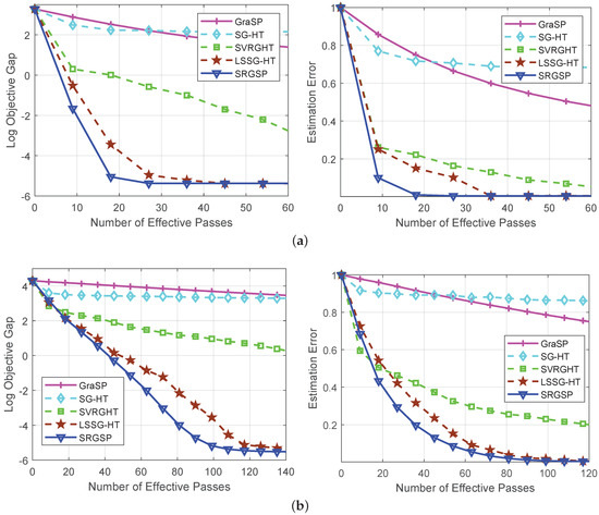 Comparison of gradient support pursuit (GraSP) [22], gradient support pursuit (SG-HT) [23], stochastic variance reduced gradient with hard thresholding (SVRGHT) [24], loopless semi-stochastic gradient descent with less hard thresholding (LSSG-HT) [34] and SRGSP for solving sparse linear regression problems on synthetic data. (a) ; (b) , , .