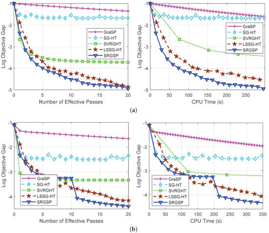 Comparison of GraSP [22], SG-HT [23], SVRGHT [24], LSSG-HT [34] and our SRGSP method for solving sparse linear regression problems. In each plot, the vertical axis shows the logarithm of the objective value minus the minimum, and the horizontal axis is the number of effective passes over data or running time (in seconds). (a) rcv1; (b) real-sim.