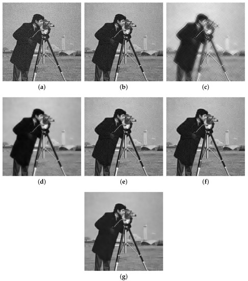 Comparison of the denoising results (PSNR/SSIM) of all the algorithms on the standard cameraman image with , where . (a) Noise image (); (b) OMP (27.62/0.6006); (c) SG-HT (22.90/0.7308); (d) GraSP (23.50/0.8453); (e) SVRGHT (27.96/0.8588); (f) LSSG-HT (27.26/0.8433); (g) SRGSP (29.08/0.8761).