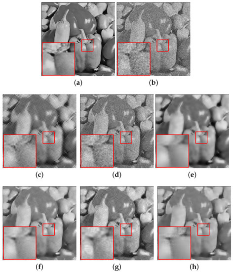 Comparison of the denoising results (PSNR/SSIM) of all the algorithms on the standard peppers image with , where . (a) Original image; (b) noise image (); (c) SG-HT (21.65/0.5514); (d) OMP (20.48/0.3529); (e) GraSP (23.91/0.7546); (f) SVRGHT (25.88/0.7390); (g) LSSG-HT (25.12/0.7023); (h) SRGSP (26.56/0.7851).