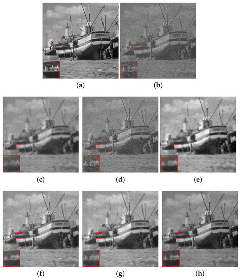 Comparison of the denoising results (PSNR/SSIM) of all the algorithms on the standard boat image with , where . (a) Original image; (b) noise image (); (c) SG-HT (22.62/0.4135); (d) OMP (16.77/0.2176); (e) GraSP (24.42/0.6146); (f) SVRGHT (24.68/0.5172); (g) LSSG-HT (25.51/0.5321); (h) SRGSP (25.68/0.6519).