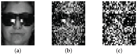 Examples of the AR face database with different levels of white Gaussian noise. (a) ; (b) ; (c) .