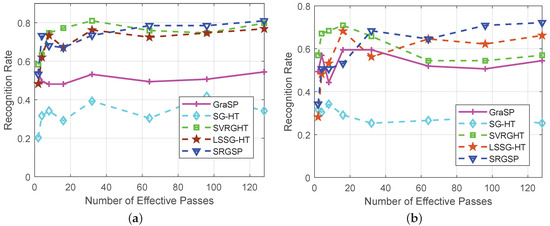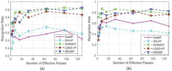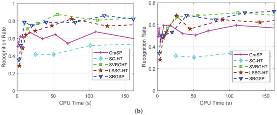 In Figure 8, SVRGHT, LSSG-HT and SRGSP obtain much higher recognition rates than other two methods on both datasets, which verifies the superiority of variance reduction or recursive gradient techniques. Although at the very early iterations, SRGSP may have slightly lower recognize rates than SVRGHT, while with the increase of iterations, SRGSP can achieve the highest recognition rate among all the classifiers. Moreover, SRGSP is several times faster than SVRGHT due to less hard thresholding operations. For example, when on the Yale B database, SRGSP obtains over recognition rate within 50 s, while SVRGHT needs more CPU time to reach the same accuracy. In fact, in the same number of passes, SRGSP still achieves the highest recognition rate among the state-of-the-art hard thresholding algorithms, which demonstrates the effectiveness and efficiency of SRGSP. In the extreme situation of the AR database with the Gaussian noise level , SRGSP still achieves a higher recognition rate than the other methods. The results of recognition rates with respect to the number of passes on both datasets are provided in Figure 9 and Figure 10, and further demonstrate the superiority of SRGSP.