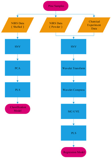 The current study investigates preprocessing and feature selection techniques to process NIR spectral data. A mathematical model was established by combining the classification labels and lipid content. Principal component analysis (PCA) was selected to reduce the dimensionality of the input data used to build the classification model. Wavelet compression techniques were used to process the data and compare the quality of the compression model and produce the best wavelet coefficient matrix. The wavelet coefficient matrix was optimized by the Monte Carlo and uninformative variable elimination (MCUVE) algorithm. The PCA–partial least-squares (PLS) and wavelet transformation (WT)–MCUVE–PLS calibration models were developed to predict the origin and lipid content of P. koraiensis seeds and were compared with other conventional methods.