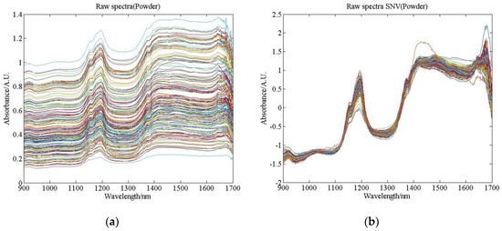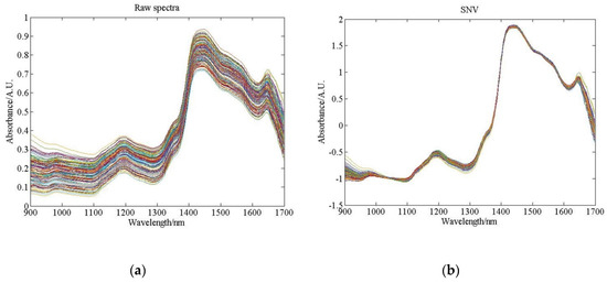 Near-infrared (NIR) raw spectra and standard normalized variable (SNV) pretreated spectra of whole pine nuts, (a) The raw spectra, (b) The SNV pretreated spectra.