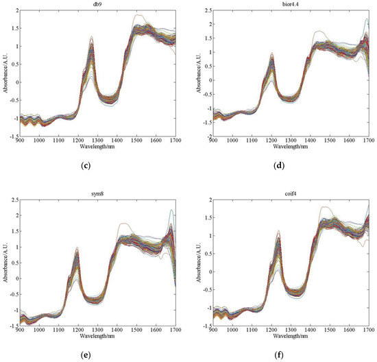 NIR raw spectra, SNV pretreated spectra, and wavelet compression spectra of pine nut powder, (a) The raw spectra, (b) The SNV pretreated spectra, (c) The spectra after being compressed by ‘db9’, (d) The spectra after being compressed by ‘bior4.4’, (e) The spectra after being compressed by ‘sym8’, (f) The spectra after being compressed by ‘coif4’.