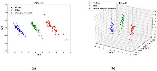 Score plots of the pine nut samples in the space defined by the first two and three principal components, (a) The visualization of PCA-2D, (b) The visualization of PCA-3D.